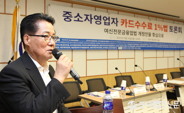 (조세금융신문=전한성 기자) '중소자영업자 카드수수료 1%법 토론회-여신전문금융업법 개정안을 중심으로'가 24일 오전 서울 여의도 국회 의원회관에서 열린 가운데 새정치민주연합 박지원 전 원내대표가 축사를 하고 있다.
