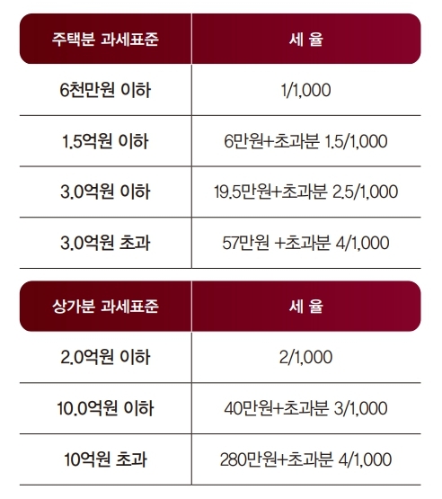 재산세는 공시지가를 기준으로 과세합니다. 통상, 주택 재산세 과세표준은 고시가격×공정시장가액 비율(60%)을 적용하며, 상가 재산세 과세표준은 고시가격×공정시장가액 비율(70%)로 계산합니다. 또한 재산세 과세표준에 따른 세율 역시 다릅니다.