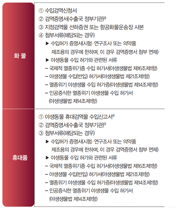 이러한 문제를 해결하기 위해 정부는 2024년 5월 19일부터 반려 목적으로 수입되는 파충류에 대해 검역을 의무화하기로 했다. 즉 도마뱀이나 거북과 같은 파충류나 그 가죽, 알 등을 관상용(반려용)·시험연구용·제품용 등으로 수입하려면 국립야생동물질병관리원2)(wadis.go.kr)으로 아래 서류목록을 제출하여 신고하고 검역받아야 한다. 따라서 파충류 수입 예정자는 화물 또는 여행자 휴대품이냐에 따라 아래의 서류를 미리 준비해야 한다.