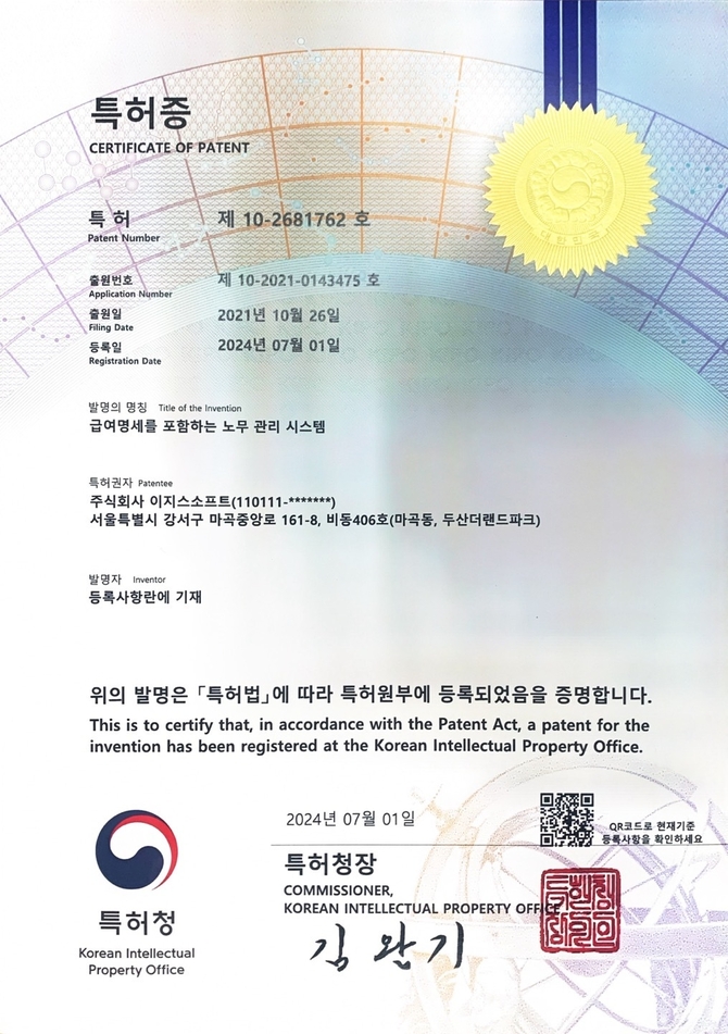 (조세금융신문=구재회 기자) ㈜이지스소프트(대표 육종민)는 ‘급여명세서 와 인사평가등 인사노무관리 시스템’에 관한 특허권을 취득했다고 9일 밝혔다.