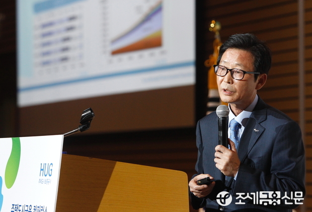 (조세금융신문=전한성 기자) 주택도시보증공사가 주최하는 '주택도시금융 컨퍼런스'가 25일 오후 서울 여의도 전경련회관 그랜드볼룸에서 개최된 가운데 김선덕 사장이 기조연설을 하고 있다.