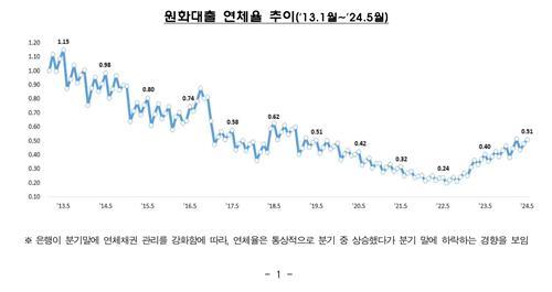 16일 금융감독원에 따르면 지난 5월 말 국내 은행 대출 연체율은 0.51%로 전월보다 0.03%포인트(p) 상승했다.