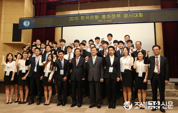 (조세금융신문=전한성 기자) '2015 통화정책 경시대회 - 전국결선대회'가 26일 오전 서울 중구 남대문로 한국은행 1별관 강당에서 열린 가운데 이주열(앞줄 왼쪽에서 여섯번째) 총재가 참가자들과 기념촬영을 하고 있다.