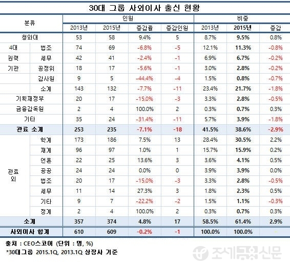 아직은 가장 막강한 집단이지만 국내 30대 그룹의 관료 출신 사외이사 비중도 점차 떨어지고 있는 추세다.