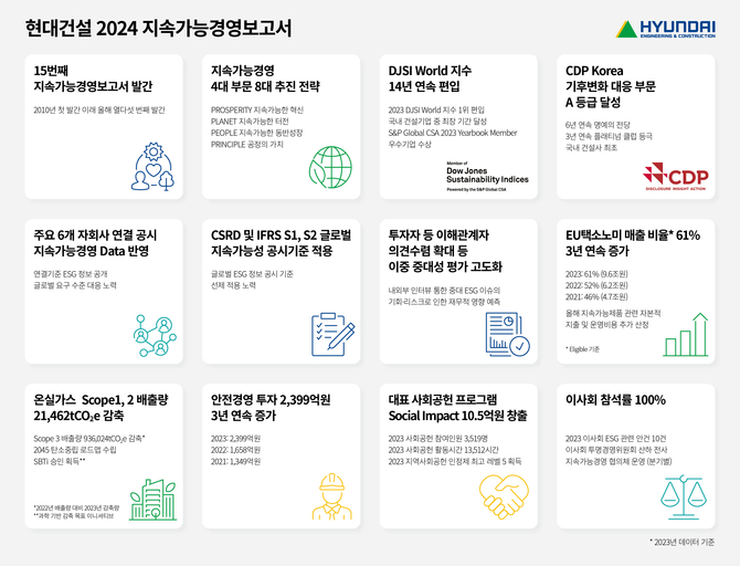 (조세금융신문=구재회 기자) 현대건설이 지속가능경영 활동과 성과를 담은 ‘2024 지속가능경영보고서’를 발간했다고 22일 밝혔다.