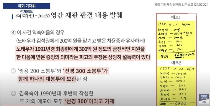 노 전 대통령의 부인 김옥숙 여사가 보관해온 1991년 선경건설(SK에코플랜트 전신) 명의 약속어음과 메모도 등장했다. 앞서 항소심 재판부는 이 메모를 근거로 노 전 대통령의 자금 300억원이 최 회장의 선친인 최종현 전 회장에게 흘러 들어갔다고 판단한 바 있다.