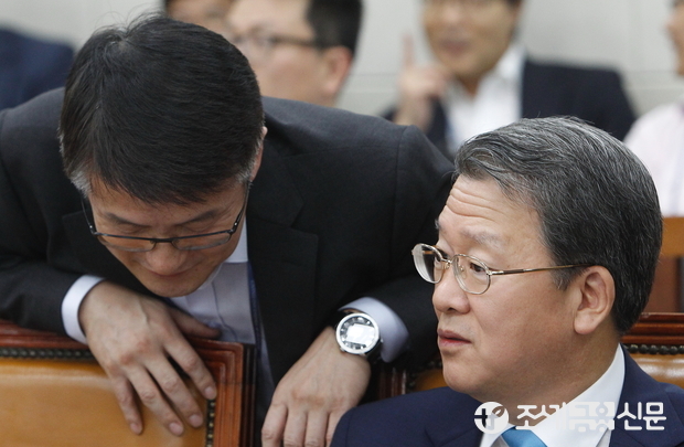 (조세금융신문=전한성 기자) 제336회 국회(임시회) 제2차 기획재정위원회 전체회의가 27일 오후 서울 여의도 국회에서 개의된 가운데 임환수(오른쪽) 국세청장이 기획재정부 문창용 세제실장과 대화 나누고 있다.