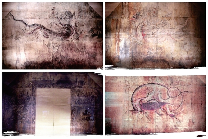 방위신(方位神)은 동방 청룡(靑龍, 청색), 서방 백호(白虎, 흰색), 남방 주작(朱雀, 붉은색), 북방 현무(玄武, 검은색)다. 사신도의 청룡은 나쁜 기운을 물리치는 영물로 도깨비 모양이다. 백호는 넓은 혀와 호피무늬의 형상으로 나쁜 기운을 물리친다.