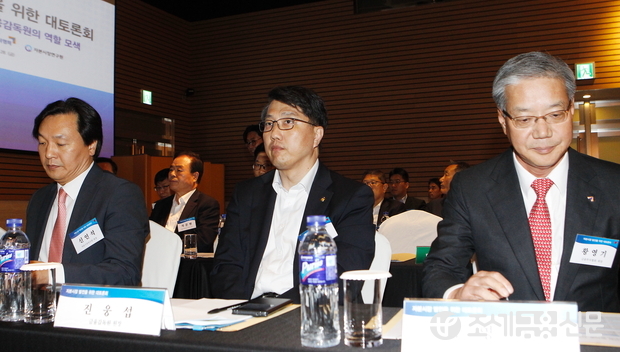 (조세금융신문=전한성 기자) '자본시장 발전을 위한 대토론회 - 금융투자업계와 금융감독원의 역할 모색'이 28일 오후 서울 영등포구 여의도동 전경련회관에서 열린 가운데 황영기(오른쪽부터) 금융투자협회장, 진웅섭 금융감독원장, 신인석 자본시장연구원장이 나란히 앉아 있다.