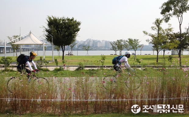 (조세금융신문=전한성 기자) 8월의 마지막날인 31일 오전 코스모스가 핀 한강시민공원에 시민들이 가을바람을 맞으며 자전거를 타고 있다.
