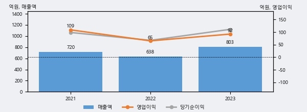 최근 실적을 살펴보면 2023년 매출액이 최근 3년 중 가장 높은 실적을 기록했음을 알 수 있다. 이전 최고 실적이었던 2021년 보다도 11.6%(83억 6천만원) 늘어난 것으로 나타났다.