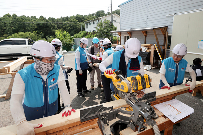 대우건설 임직원 자원봉사자는 지난 13일 천안에 위치한 해비타트 스쿨로 이동해 데크 제작, 목재 재단, 지붕 트러스 제작, 니스 작업, 도색 작업, 자재 운반 등 전반적인 골조공사 및 목공 공사를 진행했다.