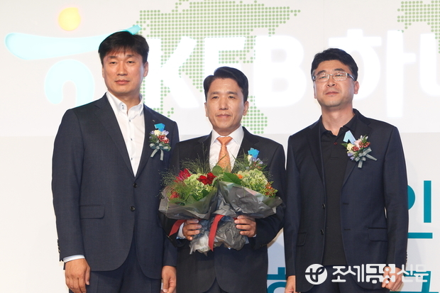 (조세금융신문=전한성 기자) 하나은행과 외환은행이 통합하여 출범하는 'KEB 하나은행 출범식 및 함영주 은행장 취임식'이 1일 오전 서울 중구 을지로 KEB 하나은행 본점에서 열린 가운데 함영주(가운데) 은행장이 김창근(왼쪽) 하나은행지부, 김근용 외환은행지부 노조 대표와 기념촬영을 하고 있다.