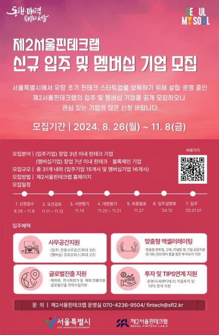 입주를 희망하는 창업기업은 모집 기간 내 제2서울핀테크랩 누리집(seoulfintechlab2.startup-plus.kr)을 통해 온라인으로 접수하면 된다.