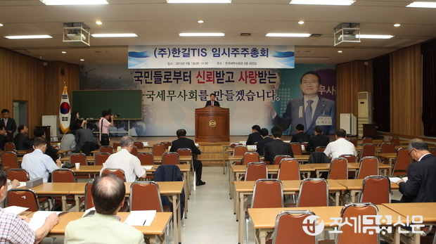 (조세금융신문=전한성 기자) '(주)한길TIS 임시주주총회'가 1일 오후 서울 서초구 명달로 한국세무사회관에서 열린 가운데 정구정 이사회의장이 인사말을 하고 있다.