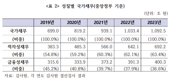 전체 정부 채무 가운데 적자성 채무의 비중도 63.4%(692.2조원)로 전년대비 2.3%p 늘었다.