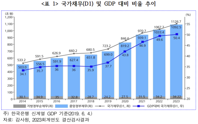 나라살림연구소가 지난 26일 발표한 ‘2023회계연도 결산 분석 – 국가채무’ 보고서에 따르면, 지난해 정부 채무는 1092.5조원으로 전년대비 59.1조원 증가했다.
