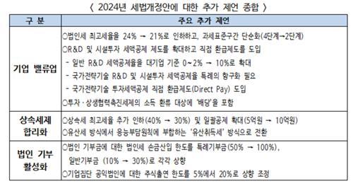 한국경제인협회 산하 한국경제연구원(한경연)은 30일 '2024년 세법 개정안 분석 및 평가' 보고서를 통해 이번 개정안의 기본방향이 경제 주체와 시장의 역동성을 높인다는 점에서 긍정적이지만 일부 부족한 부분이 있다며 개선을 제언했다.