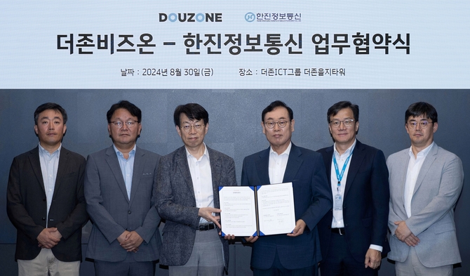 더존비즈온(대표 김용우)은 지난달 30일 서울 중구 더존을지타워에서 한진정보통신(대표 변봉섭)과 함께 성공적인 OmniEsol 공급 및 대외 사업 확대를 위한 비즈니스 파트너 업무협약(MOU)을 체결했다고 밝혔다. 더존비즈온은 앞서 KG그룹, 유진그룹 등과 OmniEsol 파트너 업무협약을 맺은 바 있다.