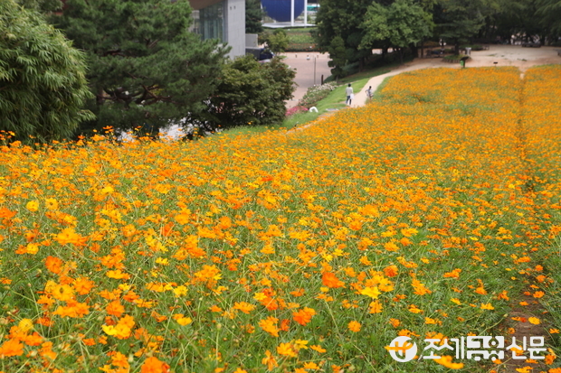 (조세금융신문=전한성 기자) 가을을 재촉하는 비가 내린 2일 오후 서울 송파구 방이동 올림픽공원 들꽃마루에 황화 코스모스가 만개해 있다.