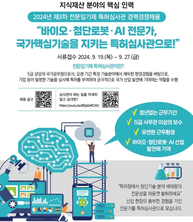 (조세금융신문=최주현 기자) 특허청은 8일 국가전략기술 분야 기업의 특허 경쟁력 강화를 위해 바이오·첨단로봇·인공지능(AI) 분야 전문임기제 특허심사관 60명을 채용하기로 했다고 밝혔다.