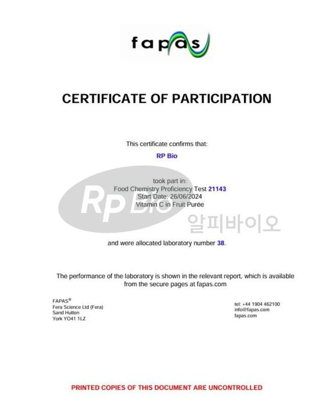FAPAS 인증은 국제표준화기구(ISO/IEC)와 국제실험실인증협력기구(ILAC)의 인증기관인 영국환경식품농림부에서 주관하는 국제 식품분야 분석 비교 숙련도 평가 프로그램(Food Analysis Performance Assessment Scheme)이다.