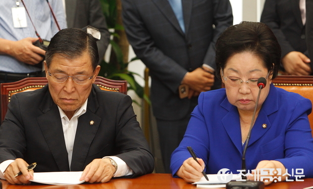 (조세금융신문=전한성 기자) 새누리당 최고위원회의가 3일 오전 서울 여의도 국회 대표회의실에서 열린 가운데 황진하(왼쪽) 사무총장과 김을동 최고위원이 자료를 살피고 있다.