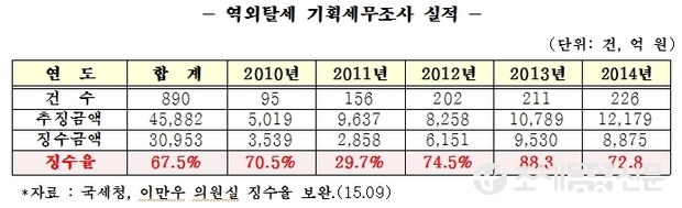 국회 기획재정위원회 소속 새누리당 이만우 의원이 국세청에서 받은 ‘역외탈세 세무조사 징수실적’ 자료를 분석한 내용에 따르면, 국세청은 최근 5년간 역외탈세 890건에 부과한 추징금액 4조 5882억 원 중 67.5%인 3조 953억 원만 실제로 징수를 한 것으로 확인됐다.