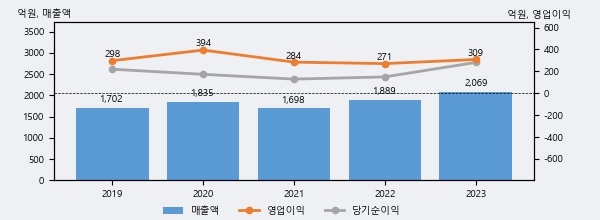 최근 실적을 살펴보면 2023년 매출액이 최근 5년 중 가장 높은 실적을 기록했음을 알 수 있다. 이전 최고 실적이었던 2022년 보다도 9.5%(179억 3천만원) 늘어난 것으로 나타났다.