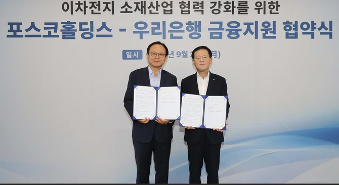 (조세금융신문=송기현 기자) 포스코홀딩스는 23일 우리은행과 '이차전지 핵심소재 경쟁력 강화를 위한 금융지원 업무협약'을 맺고 앞으로 2년간 총 1조원 규모의 금융지원을 약속받았다고 밝혔다.