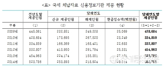 또, 국세 체납으로 인해 신용정보기관에 체납 사실이 제공되어 신용등급 평가 불이익을 받다가 뒤늦게 밀린 국세를 납부한 징수액도 ’12년 253억원, ’13년 271억원에서 ’14년 295억원에 달했다.