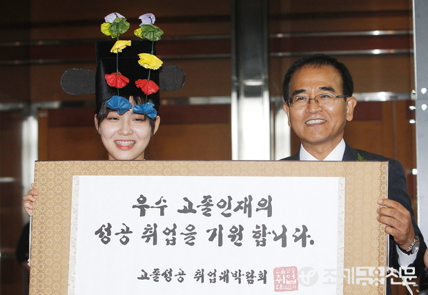 (조세금융신문=전한성 기자) '능력중심 창조인재를 위한 2015 고졸성공 취업 대박람회'가 4일 오전 서울 삼성동 코엑스 D홀에서 개막한 가운데 김낙회 관세청장이 학생에게 취업 성공 메세지가 담긴 두루마리 족자를 전한 후 기념촬영을 하고 있다.
