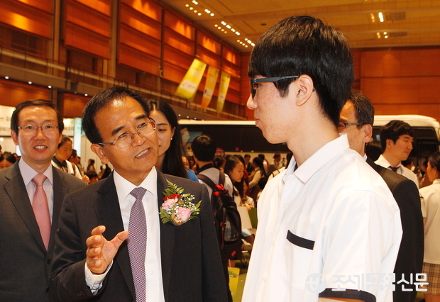 (조세금융신문=전한성 기자) '능력중심 창조인재를 위한 2015 고졸성공 취업 대박람회'가 4일 오전 서울 삼성동 코엑스 D홀에서 개막한 가운데 김낙회 관세청장이 관세청 부스에서 면접을 보는 학생에게 격려의 말을 전하고 있다.