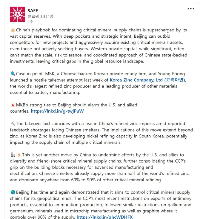 27일 고려아연에 따르면 SAFE는 최근 링크드인 SNS 채널을 통해 “중국의 지원을 받는 사모펀드인 MBK가 세계 최대의 아연 제련 기업이자 배터리 필수 소재를 생산 업체인 고려아연에 대한 적대적 인수 시도를 시작했다”며 “MBK와 중국과의 강력한 유대 관계는 미국과 동맹국들에게 경종을 울리는 사안”이라고 우려를 표했다.
