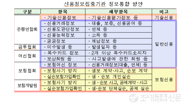 또 보험사가 보험계약 및 보험 사고정보를 집중기관에 대한 조회만으로 알 수 있도록 생·손보협회 보험신용정보를 통합한다. 보험개발원이 갖고 있던 정보 중 생·손보협회와 중복되는 신용정보는 통합되고, 보험사고정보시스템(ICPS)과 단체실손보험은 종합신용정보 집중기관으로 이전된다.