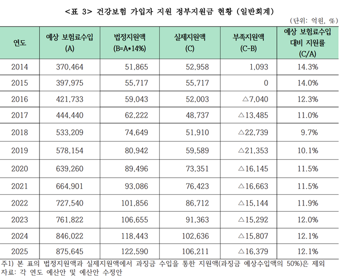 국민건강보험법에 따르면, 정부는 해당 연도 예상 보험료의 14%를 국고 지원하게 되어 있지만, 각 정부는 매년 예상 보험료의 2~5% 정도를 지급하지 않았다.
