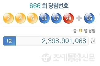 (조세금융신문=김태효 기자) 6일 실시된 제 666회 나눔로또 추첨결과 1등 당첨번호는 2, 4, 6, 11, 17, 28이다. 2등 보너스번호는 16번이다.