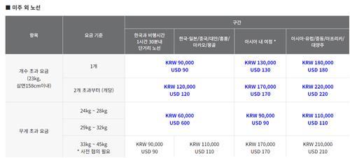 개수에 따른 초과 요금은 노선별로 1만원에서 4만원까지 오른다. 국내 출발로부터 비행시간 1시간 30분 이내인 단거리 노선은 6만원에서 9만원으로, 유럽 및 아프리카, 대양주 노선은 14만원에서 18만원으로, 미주 노선은 20만원에서 24만원으로 인상한다.