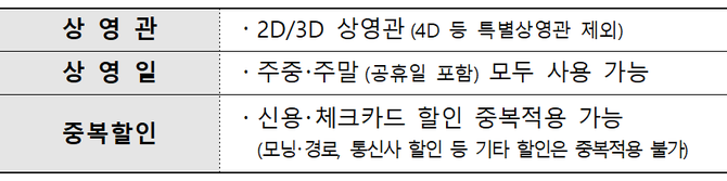 2D‧3D관을 지원하며, 발급한 날로부터 3개월이 되는 날이 속한 달의 1일까지 사용할 수 있다. 예를 들어 8월 25일 발급받으면, 11월 1일까지 사용 가능하다.
