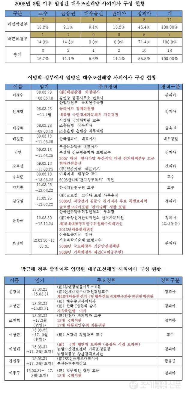 (조세금융신문=김사선 기자) 대우조선해양에 2008년 3월 이후 신규 임명된 사외이사 18명 중 12명이 정피아·관피아 출신의 낙하산으로 확인됐다.