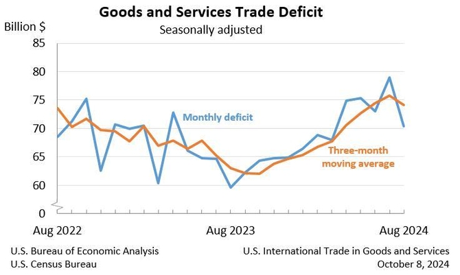 미 무역 적자는 2022년 3월을 정점으로 전반적으로 감소 추세를 이어오다가 지난해 하반기부터 지난 7월까지 상승 흐름을 보여왔다.