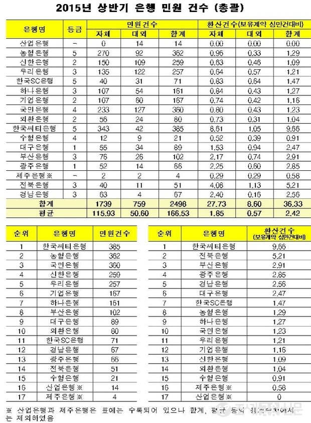 금융소비자연맹(www.kfco.org,상임대표 조연행, 이하 금소연)은 ‘2015년 상반기 은행 민원발생현황’을 분석한 결과 2015년 상반기 산업은행과 제주은행을 제외한 15개 은행의 민원 발생건수는 2,498건으로서, 은행 자체 접수건수는 1,739건, 대외 접수건수는 759건이었으며, 15개 시중은행의 평균 민원건수는 148.0건이었다.