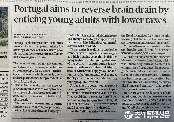 영국 경제지 <파이낸셜타임스(FT)>는 11일치 종이신문 1면 하단 기사에서 “서유럽 최빈국 포르투갈에서 집권한 중도 우파 정부가 지구촌 어느나라 재정정책에서도 전례가 없는 계획에 따라 첫해 완전 비과세를 포함, 이후 10년간 젊은이들의 소득세 부담을 줄여주려고 한다”며 이 같이 보도했다.