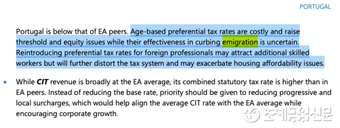 다만 “포르투갈은 팬데믹 이후 놀랍게 회복했으며, 성장률은 유로존 평균을 넘어섰고 인플레이션도 빠르게 둔화됐다”면서 “재정 상황도 크게 개선돼 2023년에 큰 재정흑자를 달성, GDP의 99%에 근접하던 공공부채도 상당부분 갚았다”고 호평했다. 그러면서 “생산성증가 둔화, 인구고령화, 투자감소 등 주요 난제가 있으니 지금 시점에서는 ‘연착륙(soft landing)’을 꾀하는 게 낫다”고 권고했다. 무리해서 세제개편을 하는 게 외려 나아지는 경제를 위협할 수 있다는 권고로 해석됐다.