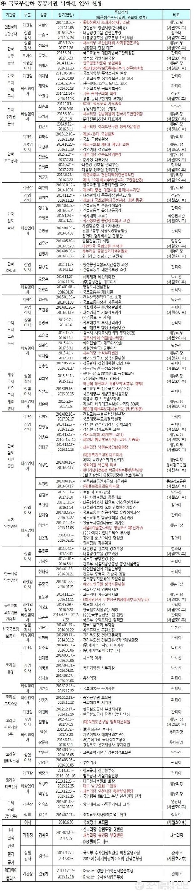 한국철도시설공단의 경우 세월호 사건 이틀 후 업무연관성이 없는데도 불구하고 ‘국회의원 박근혜 특보, 한나라당 대선경선 박근혜후보 동북부부단장’이었던 공동묘지 대표이사와 이사장을 한 날 한 시에 비상임 이사로 임명했으며 한국철도시설공단은 현재 전체 비상임 이사 7명중 5명이나 낙하산인사로 채워져 있다.