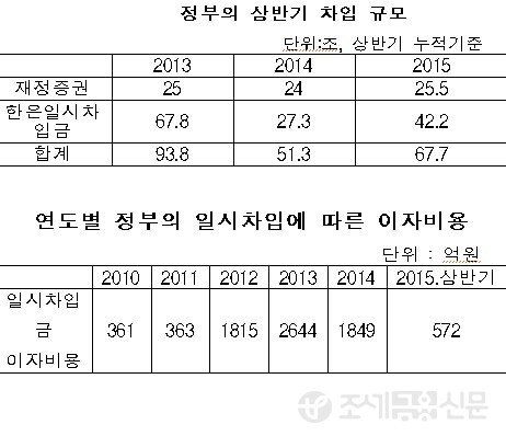 7일 국회 기획재정위원회 김관영 의원은 기획재정부와 한국은행이 제출한 재정증권 발행 및 한국은행 일시 차입 추이를 분석한 결과 올해 6월까지 일시 차입한 금액이 67조 7천억원으로 작년 같은기간보다 16조 4천억원이 늘어났다고 밝혔다.