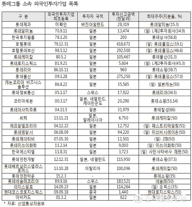 새정치민주연합 김기준의원(정무위원회)이 산업통상자원부로부터 제출받은‘롯데그룹 소속 외국인투자기업 현황’에 따르면 8개 상장기업 중 롯데제과, 롯데케미칼, 롯데손해보험 등 3개 기업이 외국인투자기업(이하 외투기업)으로 등록되어 있다.