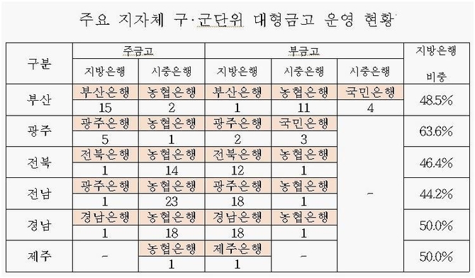 (조세금융신문=송기현 기자) 지방은행 거점 지역인 부산, 광주, 전북, 전남, 경남, 제주의 기초단체 예산을 관리하는 금고 중 절반 이상을 시중은행이 과점하고 있는 것으로 조사됐다.