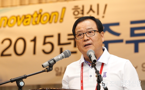(조세금융신문=전한성 기자) 전국종합주류도매업중앙회가 주최하는 '2015년 주류발전포럼 및 대토론회'가 8일 오전 대전 서구 괴정동 KT인재개발원에서 열린 가운데 오정석 회장이 개회사를 하고 있다.