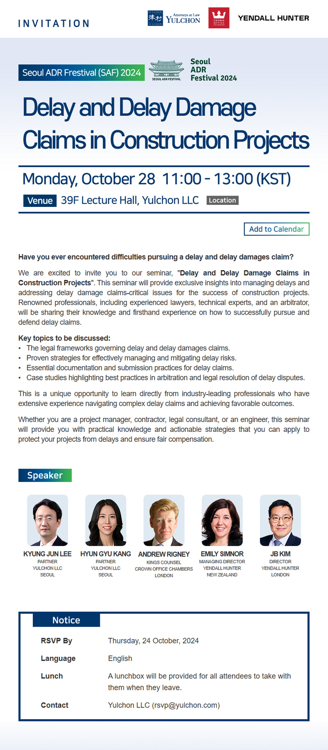 (조세금융신문=고승주 기자) 법무법인 율촌이 오는 28일 서울 강남구 삼성동 파르나스타워 39층 율촌 렉쳐홀에서 건설 분쟁 감정 전문회사 ‘옌달 헌터(Yendall Hunter)’, 법률 사무소 ‘크라운 오피스 챔버스(Crown Office Chambers)’와 공동으로 ‘건설 프로젝트에서의 지연 및 지연손해배상청구(Delay and Delay Damage Claims in Construction Projects)’ 세미나를 개최한다고 22일 밝혔다.
